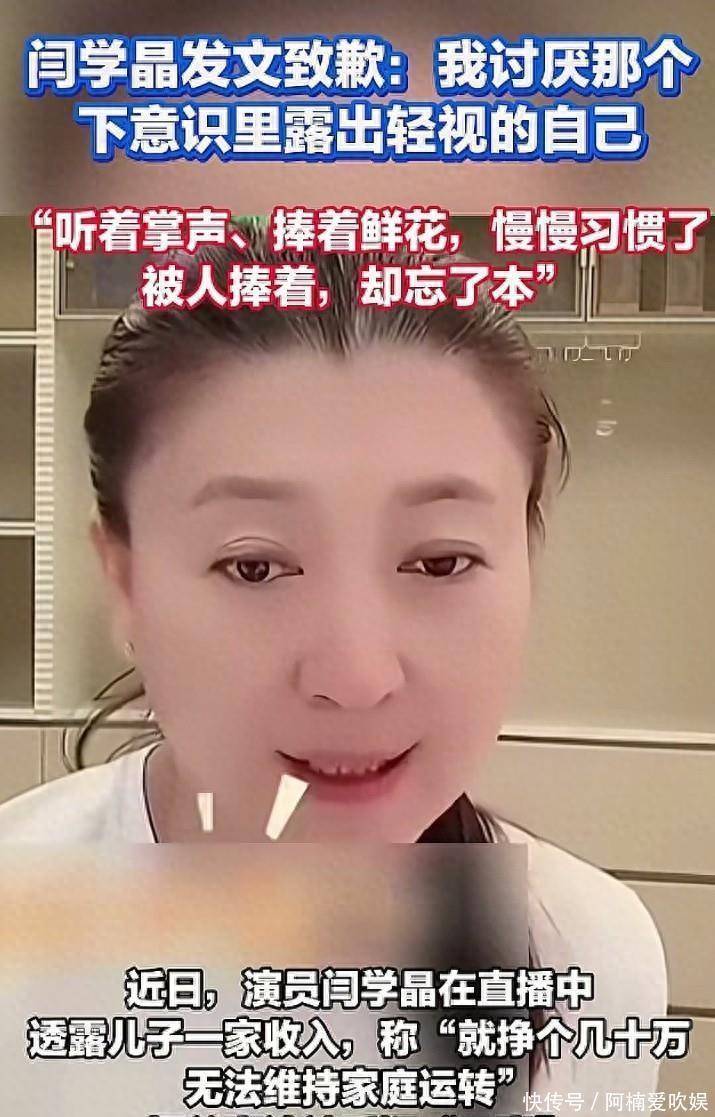 这话一出来,网友直接炸了锅。要知道咱们普通人一年收入能有10万都算不错的,全国居民人均可支配收入才3万多,横店群演一天就挣100来块,闫学晶嘴里“不够花”的80万,对很多人来说是一辈子都难攒到的数。更别说网友还扒出她住北京大豪宅、戴名表、用奢侈品,儿子还晒过吃3万帝王蟹的照片,这哪是哭穷,分明是“炫富式卖惨”。舆论发酵后,闫学晶的日子可不好过。短短两天,佐香园、统厨两个合作品牌全跟她解约了,统厨还说要索赔2000万;她抖音、快手上2000万粉丝的账号被限制关注,连常年上的辽宁卫视春晚也把她除名了。直到2026年1月11日晚上,闫学晶才终于道歉,说自己思想出了严重偏差,忘了自己是从普通家庭出来的,习惯了被捧着,不知不觉就有了优越感,还坦言“我讨厌那个下意识里露出轻视的自己”。另外,之前有人说她儿子靠中戏“新疆班”违规入学,中戏也发声明辟谣了,说她儿子是2012年以北京生源身份正常考上的,当年根本没招新疆班。